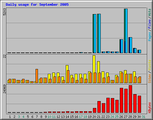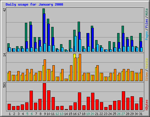 Day | Hits | Files | Pages | Visits | Sites | KBytes | ||||||