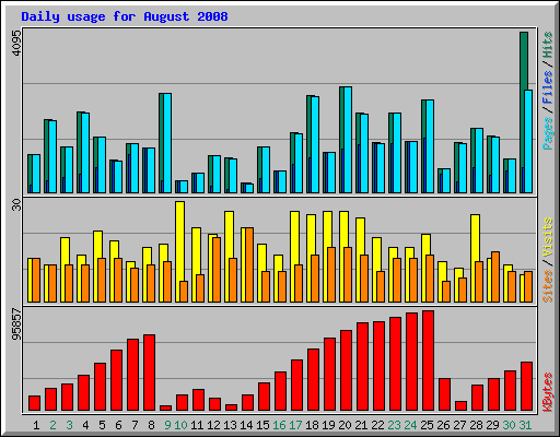 Day | Hits | Files | Pages | Visits | Sites | KBytes | ||||||